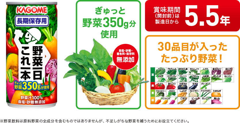 野菜飲料缶は保存できる野菜 リニューアルにより賞味期限が5.5年に延長されました!野菜ジュースは保存できる野菜です。備蓄品として栄養と水分の両方を兼ね備えた野菜ジュースを保存することをオススメします。