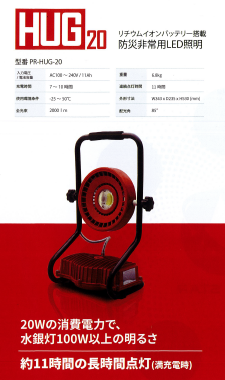 HUG20・・・バッテリー搭載型のLED証明です。20Wの消費電力で、周りを明るく照らします。