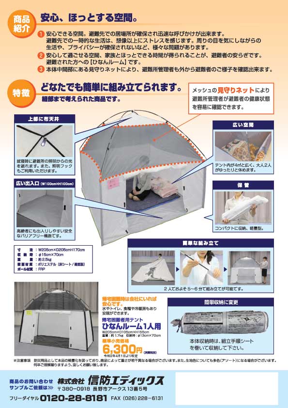 避難場所などにプライベート空間が簡単に作れます。小さくできるので収納にも困りません。
